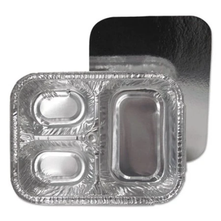 3-Compartment Oblong Aluminum Foil Container with Board Lid, 23 oz, 8.5 x 6.38 x 1.72, 250/Carton. The three-compartment tray or “Meals on Wheels” tray offers up a way to divide your meal and two sides in one container. Flat board lids are offered as well. Food Container Type: Foil Carryout with Lid; Material(s): Aluminum; Paper Board; Capacity (Volume): 23 oz; Color(s): Silver.