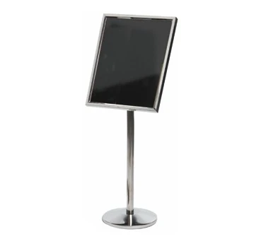 Broadcaster Display StandSingle pedestal Dual CapabilityNeon marker board on one side, menu/poster holder on other sideRound weighted baseUniversal horizontal/vertical designAcrylic windowIncludes removable cover and markersRequires little spaceDisplays menus posters and artwork attractivelyOverall frame dimension 20″H x 24″W , ID frame 17 1/2″H x 22 1/2″WFrame and base color chromeAssembles easilyOne year warranty against defects