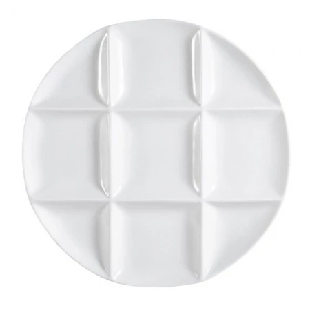 The CAC China CMP-R12 9 Compartment Round Porcelain Tray 12″ is an attractively designed round sampler tray made from super white porcelain with nine separate compartments. It is an ideal palate for serving small samples of anything from sliced vegetables and fruits, to nuts, seeds and other garnishes. Perfectly portioned, this lovely tray will upgrade any food presentation and is also oven, microwave and dishwasher safe.