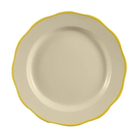 Seville Plate7-3/8″ dia. x 1″ HRoundScallop edgeDishwasher and oven safeStoneware (ceramic)Gold Band/American White