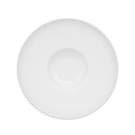 Transitions Gourmet Bowl7-1/2 oz.10-1/2″ dia. x 2-1/2″ HRound hat shapeWide rimEmbossedDishwasher, oven and microwave safePorcelainSuper White