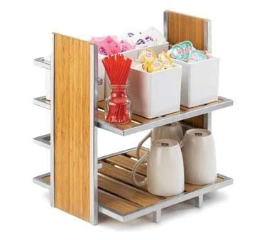 An excellent addition to your kitchen countertop, office pantry or beverage station, the Cal-Mil 1278 Eco Modern Two Tier Merchandiser 14″ x 11-1/2″ x 15″ will help you organize packets of condiments, stirrers and even mugs. This merchandiser is made with natural bamboo sides enhanced by silver accents and boasts an attractive look that will beautifully complement a variety of settings.
