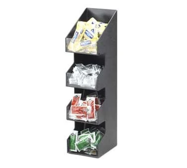 Keep packets of sugar, condiments and other essentials easily accessible with the help of the Cal-Mil 1423 Classic Four Tier Black Condiment Display with Clear Bin Fronts 5-1/4″ x 6-3/4″ x 21″. This condiment display features a vertical design which requires minimal space on your countertop. Boasting a stylish modern look with a classic black frame, this piece will complement a variety of settings.