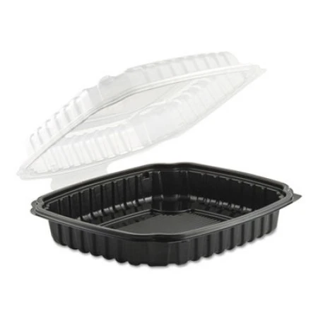 Culinary Basics Microwavable Container, 36 oz, 9 x 9 x 2.5, Clear/Black, 100/Carton. Culinary Basics can withstand temperatures up to 230°F when used under heat lamps, in warming units and microwaves. The clear lid is designed using anti-fog technology. Food Container Type: Container/Lid Combo; Material(s): Polypropylene; Capacity (Volume): 36 oz; Color(s): Clear/Black.