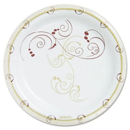 Symphony Paper Dinnerware, Heavyweight Plate, 9″, Tan, 125/Pack. Strong dinnerware with superior print quality. Clay coating and special-over varnish give a semi-glossy appearance, outstanding cut-resistance and a superb barrier against grease and other moisture. Heavyweight. Dinnerware Type: Plate; Material(s): Paper; Shape: Round; Diameter: 9″.