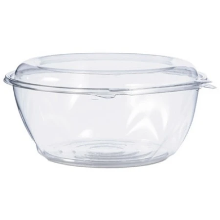 Tamper-Resistant, Tamper-Evident Bowls with Dome Lid, 64 oz, Clear, 100/Carton. TamperAlertâ„¢ hinge protrudes outward when torn, alerting the customer that the container has been opened. Hinge remains attached to the container, meaning no loose plastic pieces and therefore no littering. MicroTrimâ„¢ edge contributes to tamper-resistance by inhibiting the ability to lift up the lid from the base without tearing the hinge. 360 degree leak-resistant perimeter seal completely seals entire tray for maximum freshness and to prevent leaks. Recessed stacking platform provides greater stability of merchandising displays. Offset opening tabs and lift and hold embossing makes SafeSealâ„¢ bowls easier to open. Crystal clear container with minimal sidewall ribbing. Food Container Type: Bowl; Lid; Material(s): Plastic; Capacity (Volume): 64 oz; Color(s): Clear.