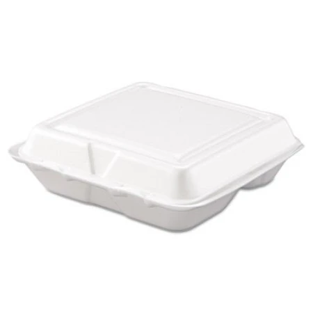 Product Details for Dart White Foam Hinged Lid, 3 Compartment Food Container, 8″ x 7 1/2″ x 2 3/10″