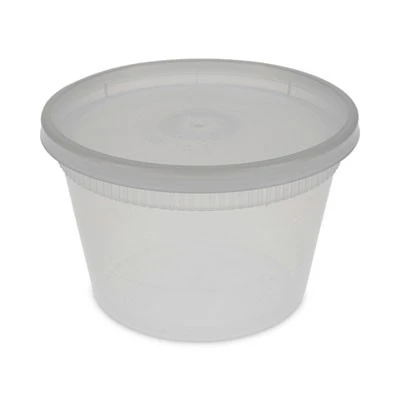 DELItainer Microwavable Combo Lid/Base, Clear, 16 oz, 2 x 2 x 2, 240/Carton. Clear, smooth-wall design enables easy order recognition. Tight, leak-resistant seal protects contents from contamination and helps prevent messy leaks and spills. Exceptional temperature resilience enables use in freezers, refrigerators and microwaves. Stackable, nest-style storage helps you make the most of your workspace. Food Container Type: Carryout; Material(s): Plastic; Capacity (Volume): 16 oz; Color(s): Clear.