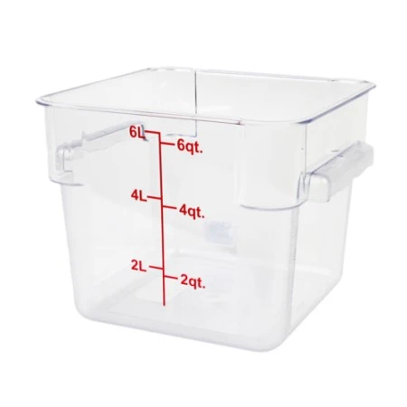 Conveniently store sauces, spices, and ready-to-serve foods in the Thunder Group PLSFT006PC Clear Storage Container 6 Qt. Featuring red graduations on its surface, this container allows you to easily estimate your inventory and its clear design ensures product visibility.