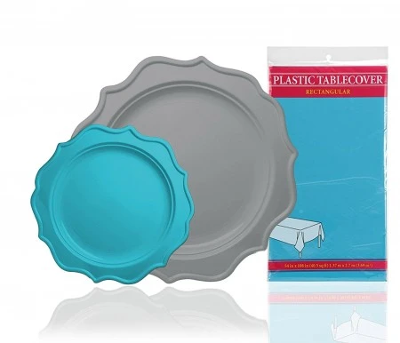 - Set includes: (24) 10″ silver plates, (24) 8″ turquoise plates, (1) 108″ x 54″ plastic turquoise tablecloth