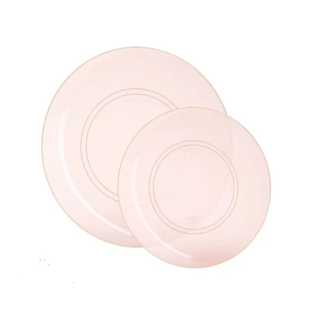 Delight your guests by adding a sophisticated touch to your table setting with the TigerChef Semi Transparent Rose with Gold Rim Plastic Dinner Plate 10-1/4″. Featuring a charming rose shade with a hint of gold along its rim, this stunning disposable tableware is the next generation of disposables for engagement parties, anniversaries, and other special occasions.