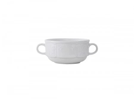 Serve your signature soups in the Tuxton CHS-105 Chicago 4-1/4″ Stackable Soup Mug. This porcelain white elegantly embossed china mug, with an 11 oz. capacity, is practical and easy to store in the kitchen. The mug is fully vitrified and lead free. It is microwave safe, dishwasher safe and oven proof.