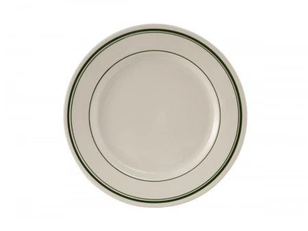 Serve your culinary delectables on the Tuxton TGB-022 Green Bay 8-3/8″ China Plate and let your guests be impressed. This American white, wide rimmed plate, with a rolled edge and green bands, will complement the decor of any restaurant. This fully vitrified, lead free plate is very durable and comes with a lifetime edge chip limited warranty.