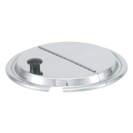 It also features a slot for a ladle or a spoon while its hinged design allows for easy access. The welded on clips on the stationary side hold it securely in place while the heat resistant Kool Touch knob makes it easy to open and close. Made from high quality stainless steel, this hinged cover is easy to clean, rust resistant, and exceptionally durable.
