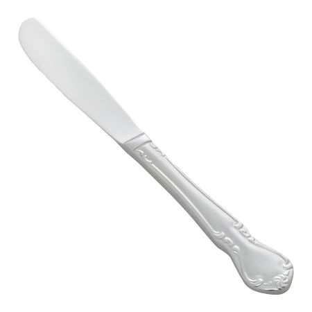 Complete your flatware collection with the Winco 0039-08 Chantelle Extra Heavy Weight Stainless Steel Dinner Knife. Beautifully accented with delicate flourished lines, this knife adds a charming yet elegant touch to any table setting.