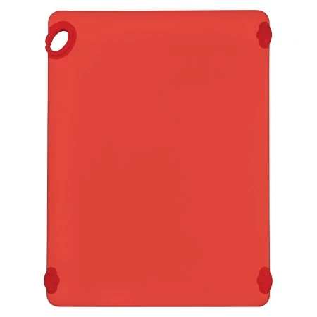 Constructed of high-quality and durable copolymer, this large red plastic cutting board will not warp, while the tough board surface can help prevent knife dulling. This cutting board features rubber gripped feet and sides to prevent it from slipping even on wet surfaces. The rubber grip hook is convenient for easy and hygienic storage. This NSF listed cutting board is also dishwasher safe for easy cleaning.