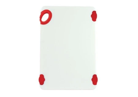 Eliminate the risk associated with a slippery chopping board with the Winco CBN-1218RD StatikBoard Cutting Board with Hook, Red 12″ x 18″ x 1/2″. Designed with molded-through, non-slip feet, this cutting board will stay in place even on a wet countertop. Designed for use following the HACCP color-coding system, this red trimmed copolymer cutting board can be assigned for cutting raw meat to prevent cross-contamination.