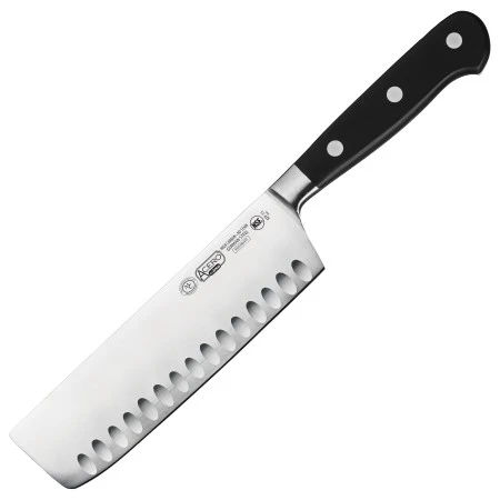 Efficiently chop, slice, and mince fresh fruits and vegetables with the Winco KFP-73 Acero Nakiri Knife with Hollow Ground Edge 7″. Shaped like a cleaver with indentations on its ultra-sharp, hollow-ground blade, this nakiri knife reduces friction and minimizes sticking.