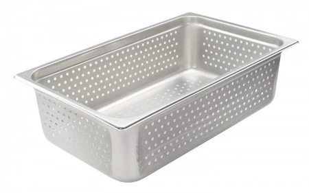 Perfect for steaming vegetables, washing greens, or draining seafood, the Winco SPJH-106PF Full Size Stainless Steel Perforated Steam Pan 6″ Deep is an indispensable addition to any commercial kitchen, The precision-pierced perforations of this well-designed pan facilitate fast drainage of excess fats, oils, and hot liquids while its flattened edge provides a comfortable hold.
