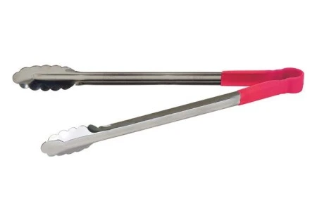Thanks to its red handle, staff can create a color-coded system to avoid cross-contamination, ensuring safety and sanitation. Made from high quality stainless steel, these easy-to-clean utility tongs are heat resistant and will withstand commercial use.