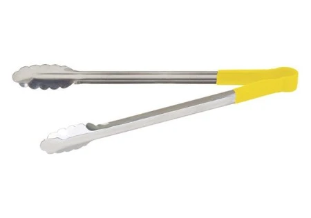 The textured non-slip polypropylene handle offers a superior grip and enhanced comfort, lowering the risk of dropping food during use. Thanks to their yellow-colored handle, staff can easily follow the HACCP color-coding system, lowering the risk of cross-contamination in any commercial kitchen. Made from stainless steel, these utility tongs are easy to clean, rust resistant, and will withstand heat up to 220°F.