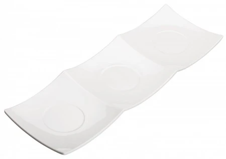 Serve side dishes like guacamole, wasabi, and other condiments in the Winco WDM006-201 Ardesia Akila Melamine White Trio Plate 16-3/8″ x 5-1/2″. Designed with three sections, this plate allows you to serve different sides and condiments simultaneously making it ideal for restaurants or other food service venues.